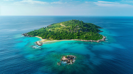 A vibrant island covered in dense greenery stands out against the deep blue ocean. The rocky shoreline contrasts with the surrounding clear waters under bright sunlight.