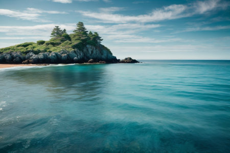 Travel and summer vacation. Illustration of sea and beautiful green nature island. Natural island at ocean. Beauty of nature concept backgrounds. Copy ad text space. Generative Ai illustration