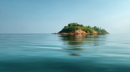 This image showcases a tranquil island with lush greenery surrounded by calm waters, reflecting its beauty under a clear sky, perfect for nature enthusiasts.