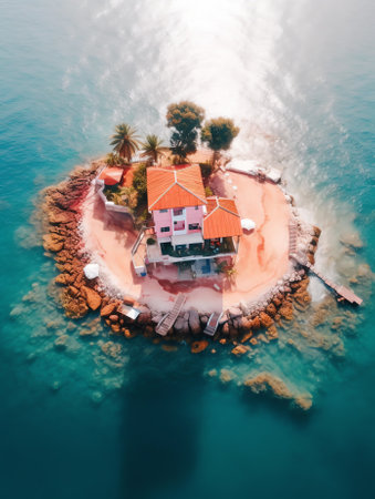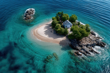 Aerial view of a small island with a house, beach, and trees in turquoise water