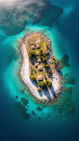 Aerial view of a secluded tropical island surrounded by crystal-clear waters