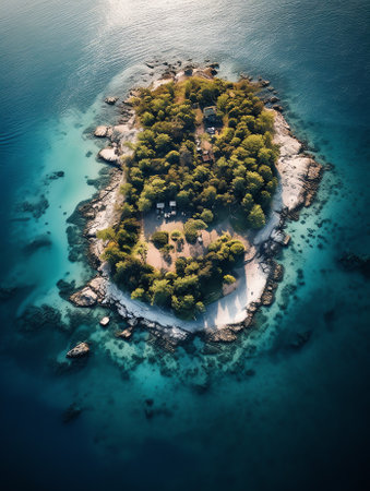 This captivating aerial image showcases a secluded island with lush greenery surrounded by serene turquoise waters, ideal for nature lovers and travel enthusiasts.