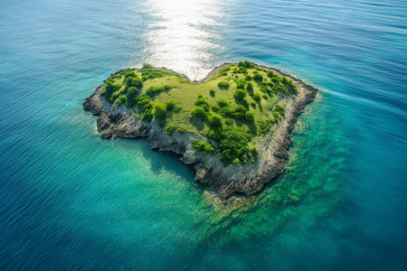 Aerial view capturing a heart shaped tropical island with lush greenery, rocky formations, and a small sandy beach, surrounded by vibrant turquoise waters