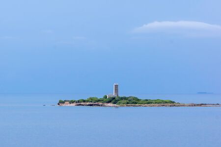 an island in the distance in the sea, blue sky with clouds, beautiful scenery in Montenegro, Adriatic Sea, tourism and travel