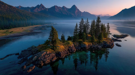 An aerial view presents a small island covered in trees amidst a serene lake, with a mountain range in the background. The scene is bathed in soft light, suggesting sunrise or sunset. The composition emphasizes natural elements such as water, land, and sky, and could be utilized for various commercial and editorial projects.