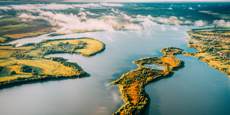 Top view of a serene green dairy farm island surrounded by blue water, with copy space for text or branding