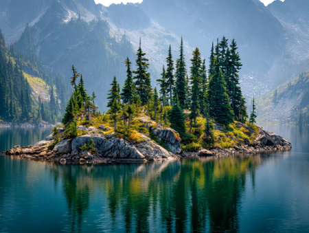 Dawn's gentle light baths a tranquil mountain reservoir, where a rugged islet adorned with pines and vibrant greenery mirrors the peaceful sky.