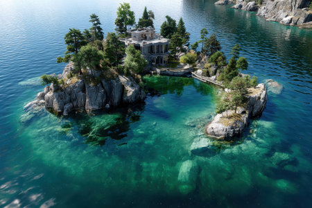 A secluded island features a stone building amid vibrant trees and crystal-clear waters, perfect for exploration.