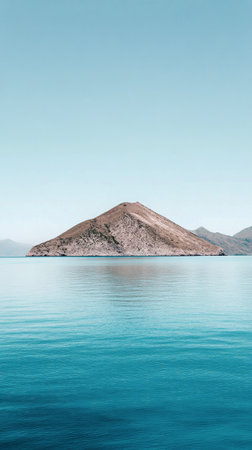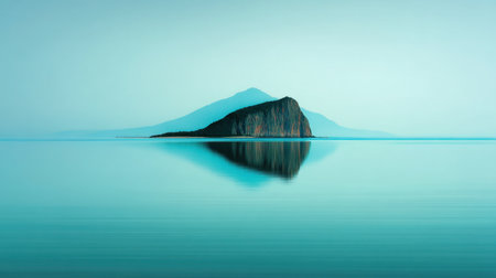 Discover a peaceful landscape featuring an isolated island reflecting in calm waters, surrounded by soft blue tones and distant mountains, perfect for relaxation.