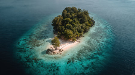 Aerial view of a small tropical island with lush vegetation emerging from turquoise waters, creating a picturesque and serene scene, ideal for concepts related to travel, tourism, and escape