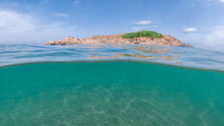 A view of an island half undersea and half of the shore of lonely island, half underwater and half of the island in the middle of Mediterranean sea, Swimming in crystal clear sea water, Jijel algeria.