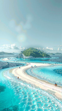Serene island landscape with turquoise waters and sandy shores in hexagonal patterns.