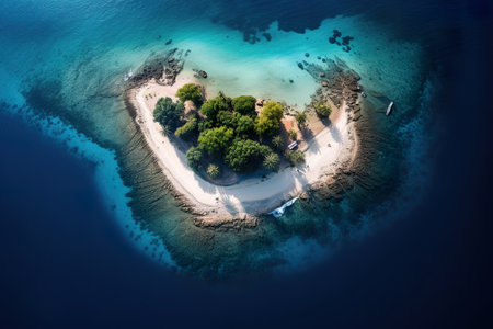 Aerial view capturing a heart shaped tropical island with lush greenery, rocky formations, and a small sandy beach, surrounded by vibrant turquoise waters