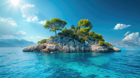 A small tropical island features dense green foliage on a sandy shore, engulfed by turquoise waters. The sun shines brightly, creating a serene marine landscape, inviting exploration.