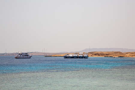 White yachts tourists in Bay Akaba background Red sea and Tiran Kingdom Saudi Arabia, island near Sharm El Sheikh in Egypt
