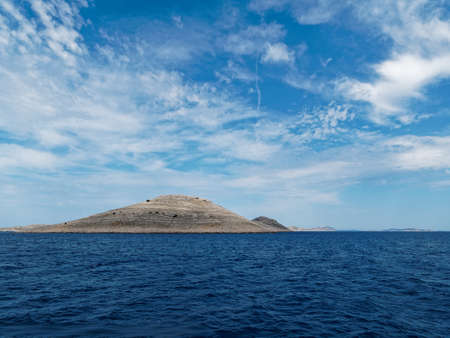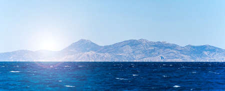 Rocky island in the distance over the beautiful blue sea. Horizontal frame