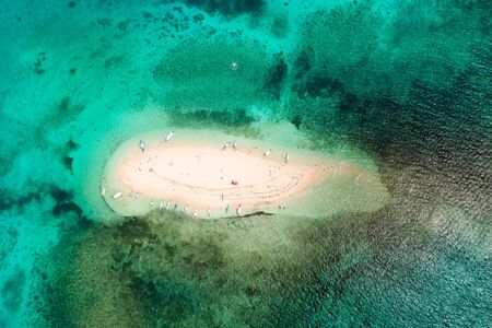 Naked Island, Siargao. The white sandy island is surrounded by a coral reef, a top view. Philippine nature.