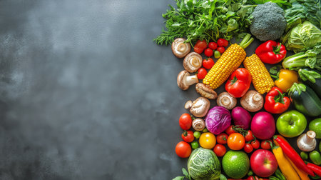 An array of colorful vegetables, including broccoli, tomatoes, corn, and peppers, is arranged neatly on a dark surface. Fresh greens add to the vibrant display.