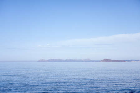 Foggy sea coast of Crete, Greece with mountains and clear blue sky on a background.