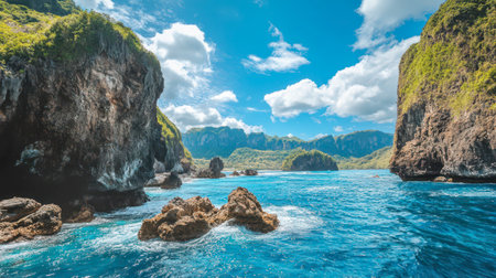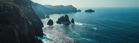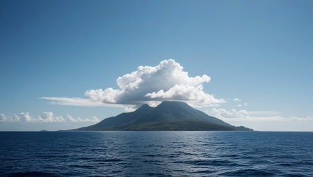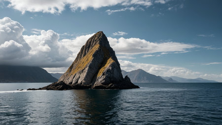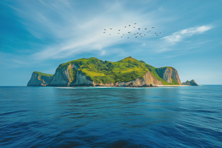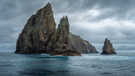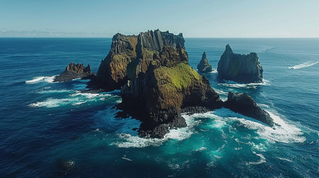 Majestic volcanic island rising from the ocean, with dramatic cliffs and unique rock formations, set against a backdrop of rolling waves and a clear horizon Generative AI
