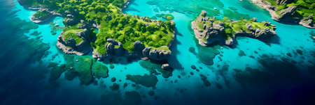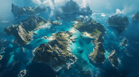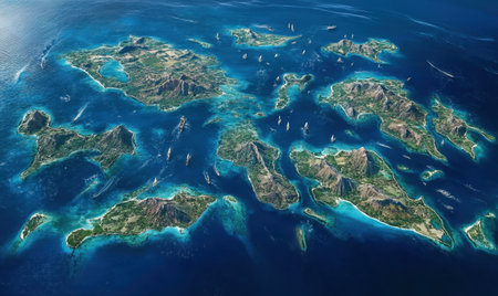 beauty of natural archipelagos from above, highlighting the patterns created by interconnected islands, reefs, and lagoons.