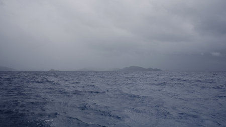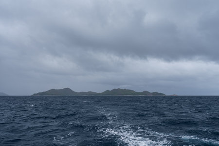 Sailing on a boat around Seychelles island on a foggy day