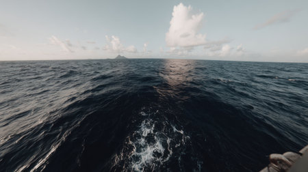 A first-person perspective from a vessel sailing on choppy, dark blue sea water. The wake trails behind as the boat moves towards a remote island on the horizon under an overcast sky.