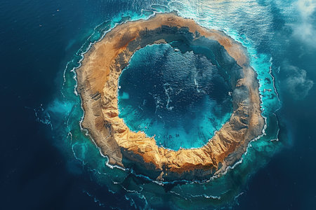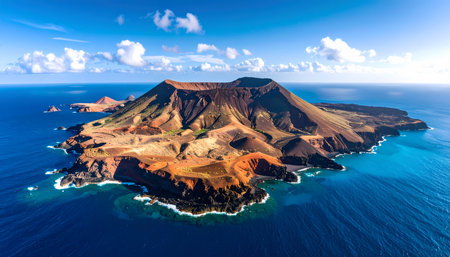 A serene aerial view of remote volcanic island with large crater. deep blue ocean water surrounds arid coast under vast sky, majestic travel destination