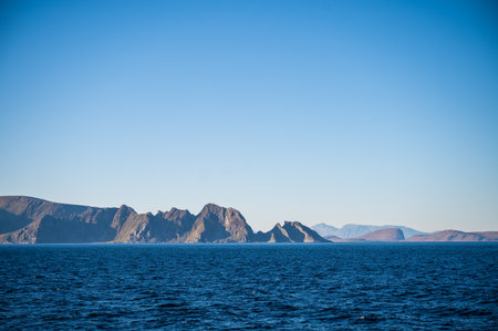 A serene seascape with a mountainous island in the distance under a clear blue sky.