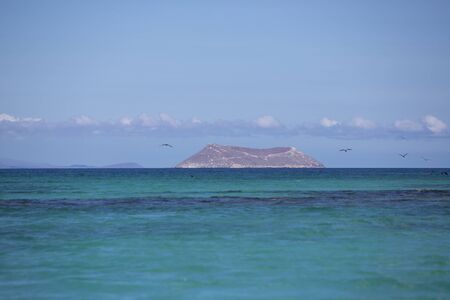 Blue Pacific Ocean and Inhabited island with clear blue sky. Galapagos Islands. Ecuador 2015