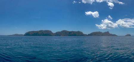 Aerial view: Lagoon with blue, azure water in the middle of small islands and rocks, Palawan. Beach, tropical island, sea bay and lagoon, mountains with forest, Coron. Busuanga. Seascape, tropical landscape. Philippines. Travel concept