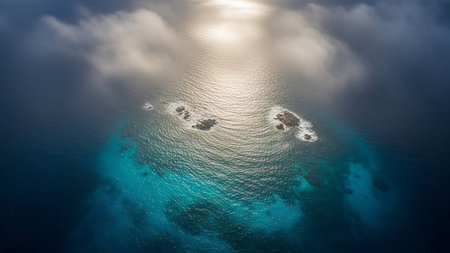 Satellite view of a remote island showing detailed topography and surrounding waters with bright blue hues. Generative AI