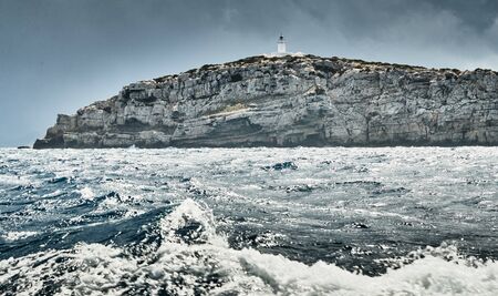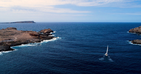 Sailboat while cruising, sailing at opened sea. Island with Lighthouse in beautiful deep blue sea. View from above, stunning aerial view, drone background. Concept of travel, tourism or summer.