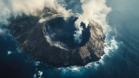 Volcanic island seen from above, with steam rising from the crater generative ai