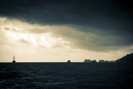 Classic sailing ship in the light of a huge storm