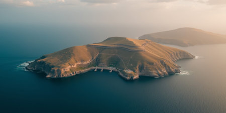 high-altitude shot of a volcanic island in the ocean, created with generative ai
