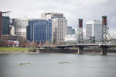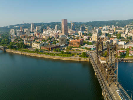 View of Hawthorne Bridge over Willamette River in downtown Portland, USA