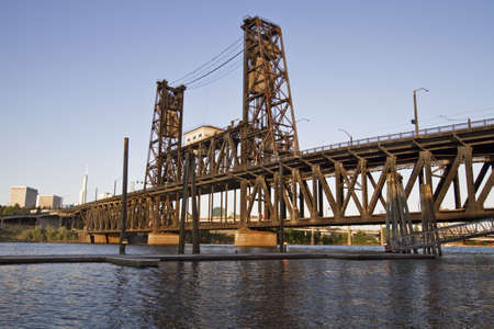 Classic old metal bridge truss lift with the lifting mechanism on the two towers over the River Willamette, Portland, Oregon on a background of blue sky with clouds