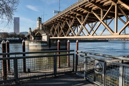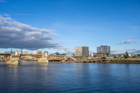 Portland, OR, USA - Oct 14, 2022: Day view of the Willamette River and embankment near the red steel Broadway Bridge in Portland, Oregon