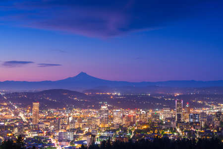 Portland, Oregon, USA skyline at dusk with Mt. Hood in the distance.