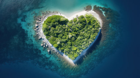 Tropical island in the shape of a heart in the sea. AI generative. illustration in photorealistic style.