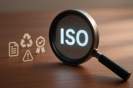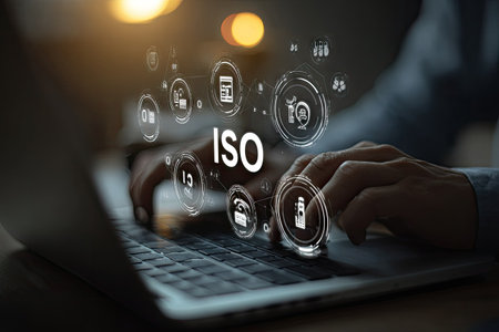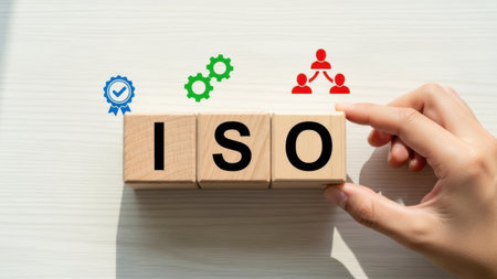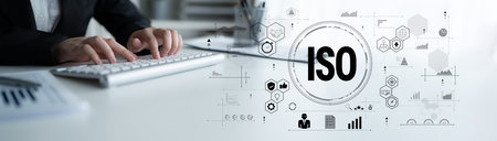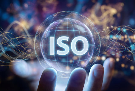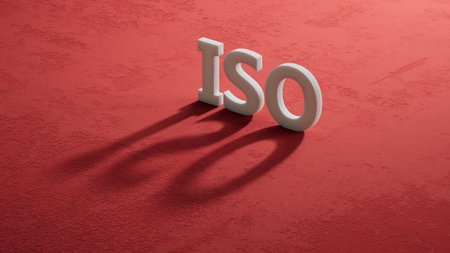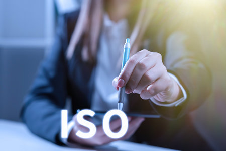 The letters ISO appear on a smooth, tech-inspired background. ISO standard for quality control management. Generative AI