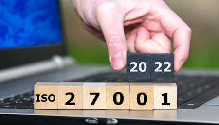 Wooden cubes form the expression 'ISO 27001 2022'.