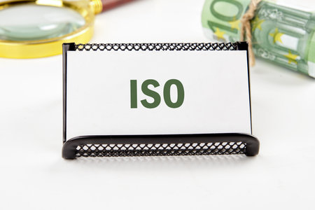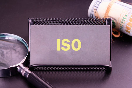 Business and ISO concept. ISO standards quality control symbol. Concept word ISO on a business card in a composition with Euro banknotes and a magnifying glass out of focus