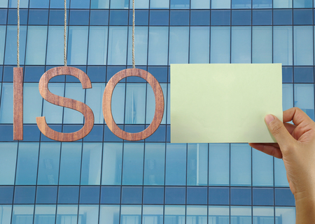 Wooden ISO text Stands for International Organization for Standardization hanging on rope and businessman hold a green paper on Skyscraper background.