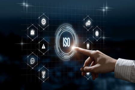 Businessman showing an icon of a globe with ISO text. Technology innovation on a virtual screen. Concept of ISO certification, global standards, and quality assurance