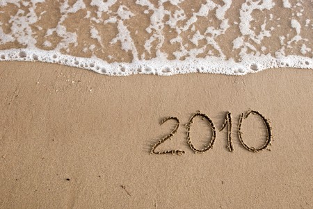 Happy New Year 2020 written on seashore sand at sunrise concept.beautiful sandy beach and soft blue ocean wave