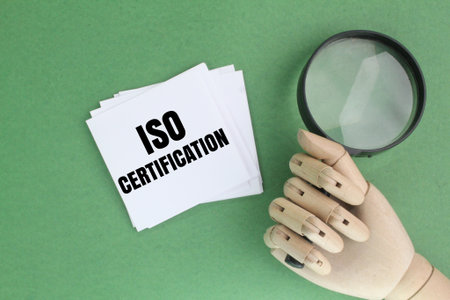 magnifying glass, and white paper with the word ISO certification. certification concept. ISO quality control certification concept