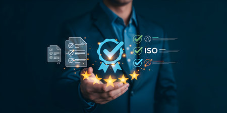 Concept of ISO certification for business quality management. This international standard ensures compliance, process control, and assurance for products and services.