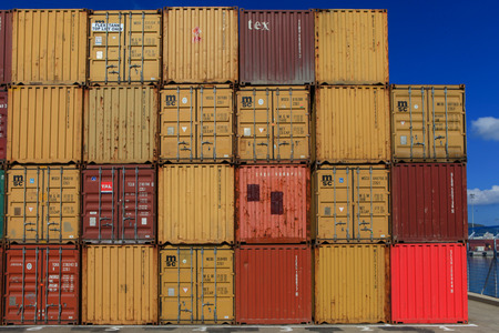 stack of colorful cargo containers, sea freight shipment and delivery concept. High quality photo
